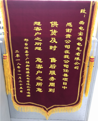 12月6日,西电宝鸡电气收到邢台任县中广核新能源发电有限公司赠送的锦旗,感谢公司优质履约邢台任县风电场一期高低压柜项目,赞誉西电宝鸡电气在该项目上“供货及时、售后服务周到、想客户之所想、急客户之所急” 。