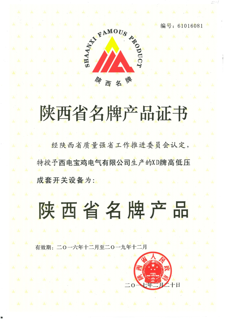 2、2月20日,陕西省人民政府陕政办函(2017)51号文件公布我公司申报的XD牌高低压开关设备再次荣获陕西省2016年名牌产品称号。
