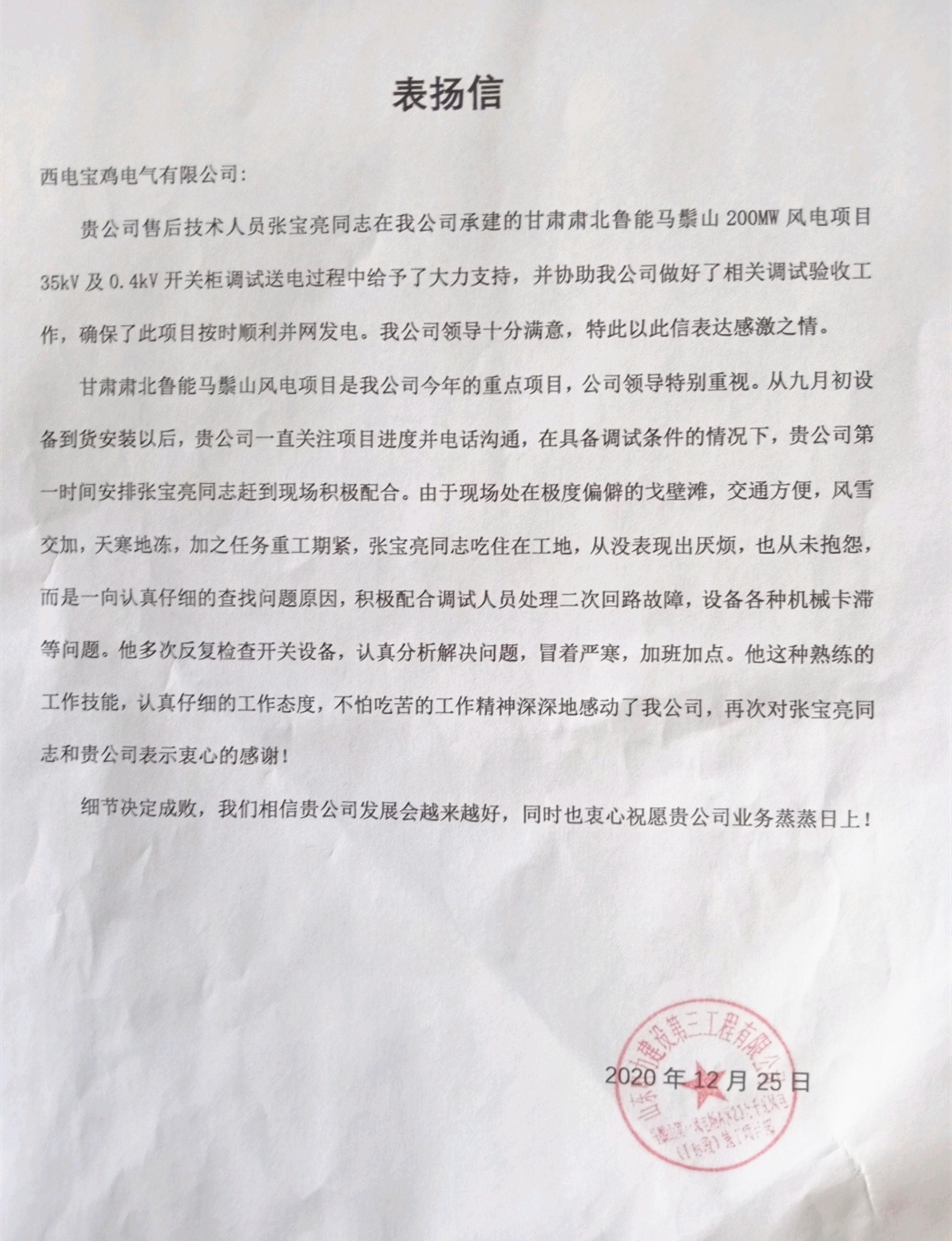 近日,西电宝鸡电气、宝光智能先后收到华能新疆吉木萨尔发电有限公司、山东电力建设第三工程有限公司、山东济宁圣地电业集团有限公司济宁金塔110KV输变电工程施工项目部、大唐内蒙古分公司蒙中事业部四封感谢信。 四封感谢信都对西电宝鸡电气、宝光智能“急用户所急、想用户所想”的工匠精神表示高度认可和表扬;对公司运维服务工作人员熟练的工作技能,认真的工作态度、不怕吃苦的工作精神表示衷心的感谢;全心全意为工程建成投产提供了重要保障,充分彰显了央企担当,并希望双方能够精诚合作,共同创造更多的精品工程。