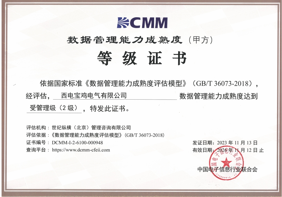 近日,中国电子行业信息联合会颁发了西电宝鸡电气数据管理能力成熟度(受管理级2级)证书,这是西电宝鸡电气继8月份获得陕西省工信厅“2023年DCMM贯标试点企业”后,在数据管理方面取得的又一重要荣誉,标志着西电宝鸡电气数据管理迈上新的台阶。
