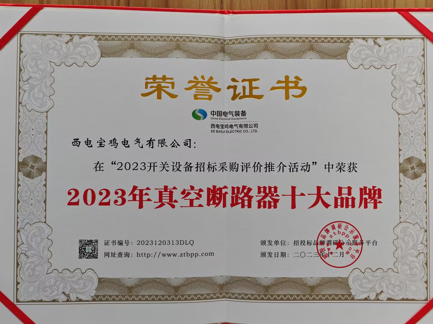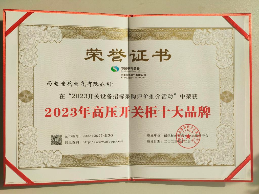 近日,西电宝鸡电气在招投标品牌调研公示服务平台主办的“2023开关设备招标采购评价推介”活动中,获得“2023年高压开关柜十大品牌”、“2023年真空断路器十大品牌”殊荣。本次活动受到招投标各方的广泛关注,吸引全国285家业内知名企业参与,经过近二个月的激烈角逐,西电宝鸡电气高压开关柜、真空断路器产品凭借先进的生产工艺、稳定的产品质量、优质的系统服务,赢得了广大用户的广泛好评,充分彰显了西电宝鸡电气在电力成套开关设备及核心元器件行业内卓越的实力与领先地位,赢得业内广泛关注与好评。