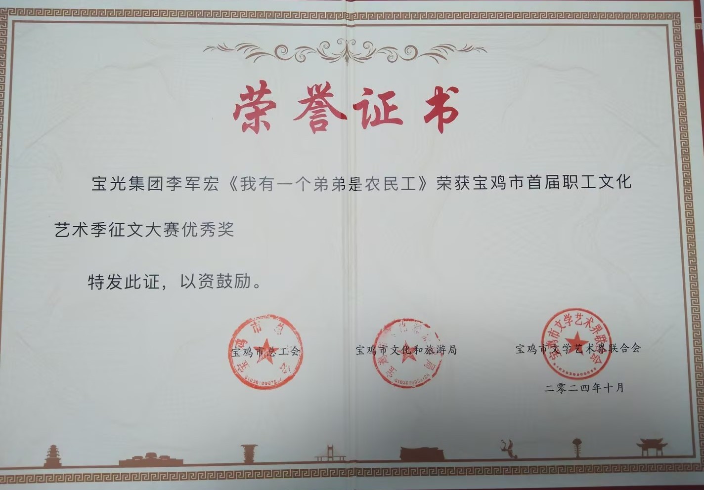 由宝鸡市总工会、宝鸡市文旅局、宝鸡市文学艺术界联合会主办,宝鸡市工人文化宫承办的“中国梦.劳动美——凝心铸魂跟党走 团结奋斗新征程”首届宝鸡市职工文化艺术季。西电宝鸡电气李军宏在征文大赛中表现出色,散文《我有一个弟弟是农民工》在500多篇征文中脱颖而出,荣获优秀奖,这是个人的实力,也是企业的荣誉。