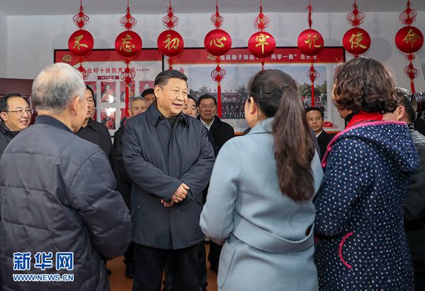 之后,习近平又来到附近的潘安湖街道马庄村考察。在村史馆,习近平看图片、看资料、看实物,肯定该村从单纯以煤为生转型到多种产业共同发展的经验,指出发展特色产业、特色经济是加快推进农业农村现代化的重要举措,要因地制宜抓好谋划和落实。在党员活动室,习近平走进正在学习党的十九大精神的党员中间,听他们谈学习体会,看他们的学习笔记,问他们感受最深的是什么、有什么意见和建议,希望他们在学习贯彻党的十九大精神中发挥积极作用。他指出,农村基层党组织是农村各个组织和各项工作的领导核心,要强化农村基层党组织职能,把农村基层党组织建设成为宣传党的主张、贯彻党的决定、领导基层治理、团结动员群众、推动改革发展的坚强战斗堡垒。